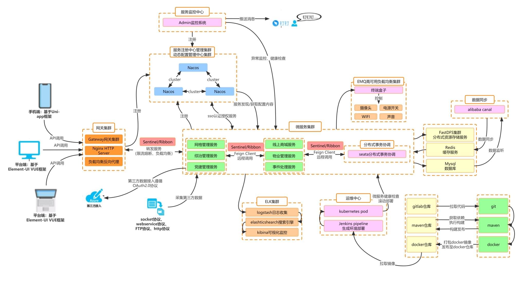 系统采用前后端分离的模式,前端基于 Vue、 Element-UI,后端采用Spring Cloud Alibaba 全家桶,并同时对其基础组件做了高度的封装,单独开源出一个框架:Maven中央库引入即可,减少了工程的臃肿,也可更注重于业务开发 集成Sentinel从流量控制、熔断降级、系统负载等多个维度保护服务的稳定性。注册中心、配置中心选型Nacos,为工程瘦身的同时加强各模块之间的联动。